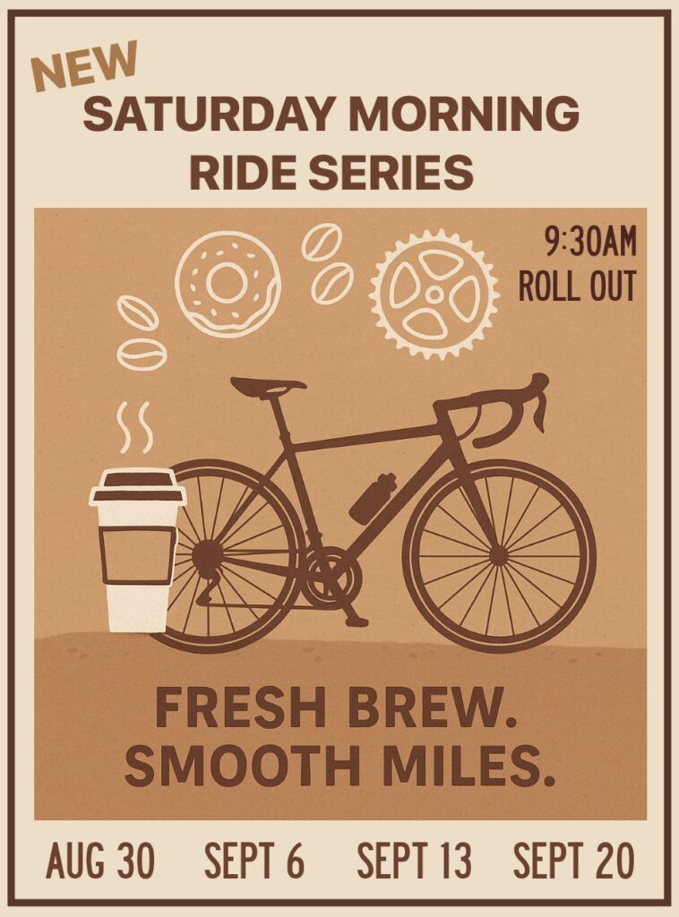 | Join us Saturday mornings for our new Morning Grind Ride Series — a perfect blend of smooth miles and fresh coffee. We’ll roll out at 9:30 for a nice road ride and enjoy great company along the way. After the ride, stick around for coffee and donuts at the shop.